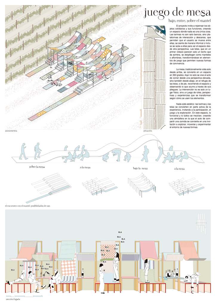 Nada está estático: las tarimas y las telas se convierten en parte activa de la experiencia, invitando a la participación, el juego y la exploración. En este espacio, lo funcional y lo lúdico se mezclan, creando una atmósfera en la que el acto de compartir una comida se convierte en una invitación a explorar, moverse y experimentar el entorno de nuevas formas.