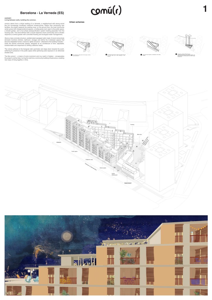En conjunto, comú(r) se plantea como una intervención urbana sostenible, adaptable e inclusiva que combina vivienda, equipamientos comunitarios y espacios verdes. Su carácter participativo y su enfoque integral lo convierten en un modelo replicable para otros barrios con necesidades similares y en una propuesta transformadora para el futuro de La Verneda.